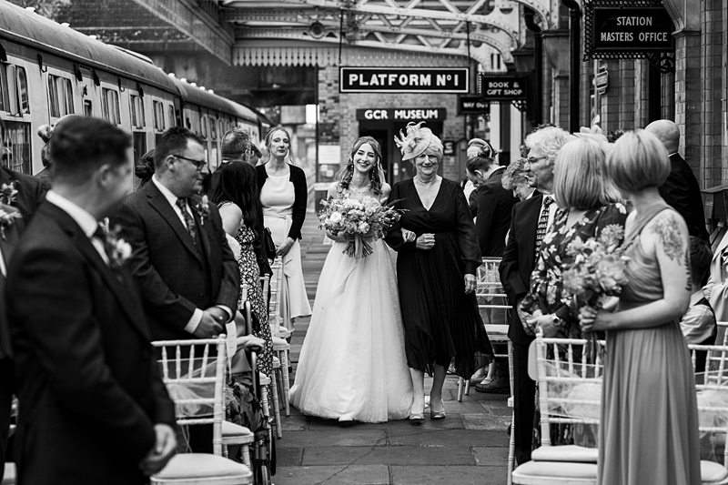 Heather was radiant, her smile lighting up the station. After capturing her arrival, I headed to platform one where the ceremony was set to take place. The vintage feel of the station made for a breathtakingly unique wedding venue setting. It was especially meaningful because James worked here, so every staff member congratulated him too, making it feel even more personal and special.